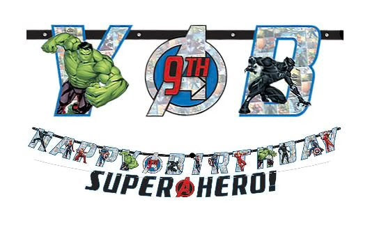 Make your little superhero feel extra-special by decorating their birthday party with an Avengers Unite Personalized Banner Kit! This kit includes a "Superhero" banner with the Avengers logo in the center, and a "Happy Birthday" banner featuring Black Panther, Captain Marvel, Iron Man, Captain America, and Hulk. The birthday banner includes numbers and letters to celebrate a birthday of any age. Hang these banners on the wall to decorate for your child's Marvel-themed party!