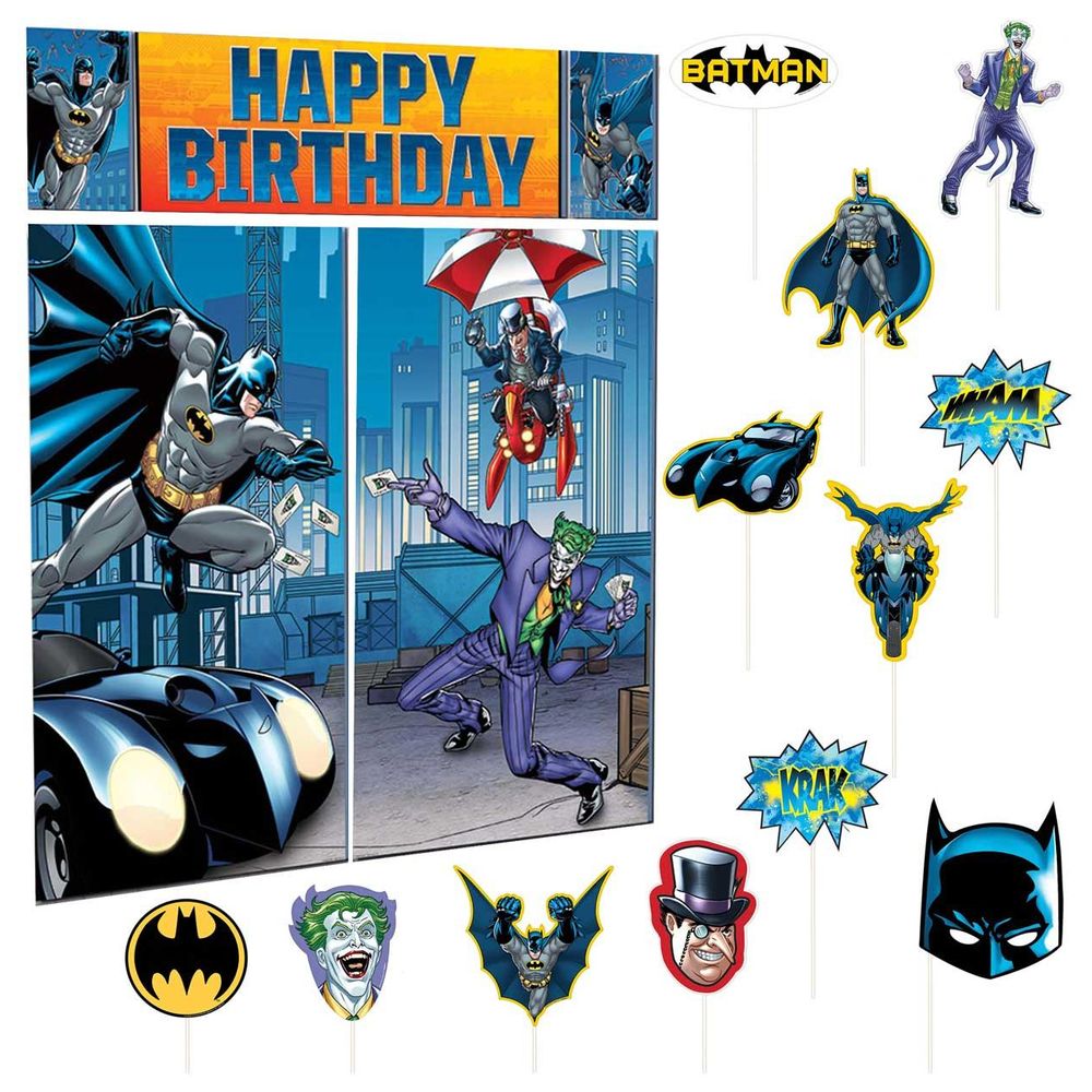 Batman Screen shutter. Use in Super hero, Batman Theme Party. Invite the Caped Crusader to your party with our Batman Birthday Scene Setter. This five-piece decoration features an epic illustration of Batman in action against his arch nemeses, Mr. Penguin and the Joker. This scene setter is super for indoor and outdoor use and measures over 6 feet all when fully assembled.