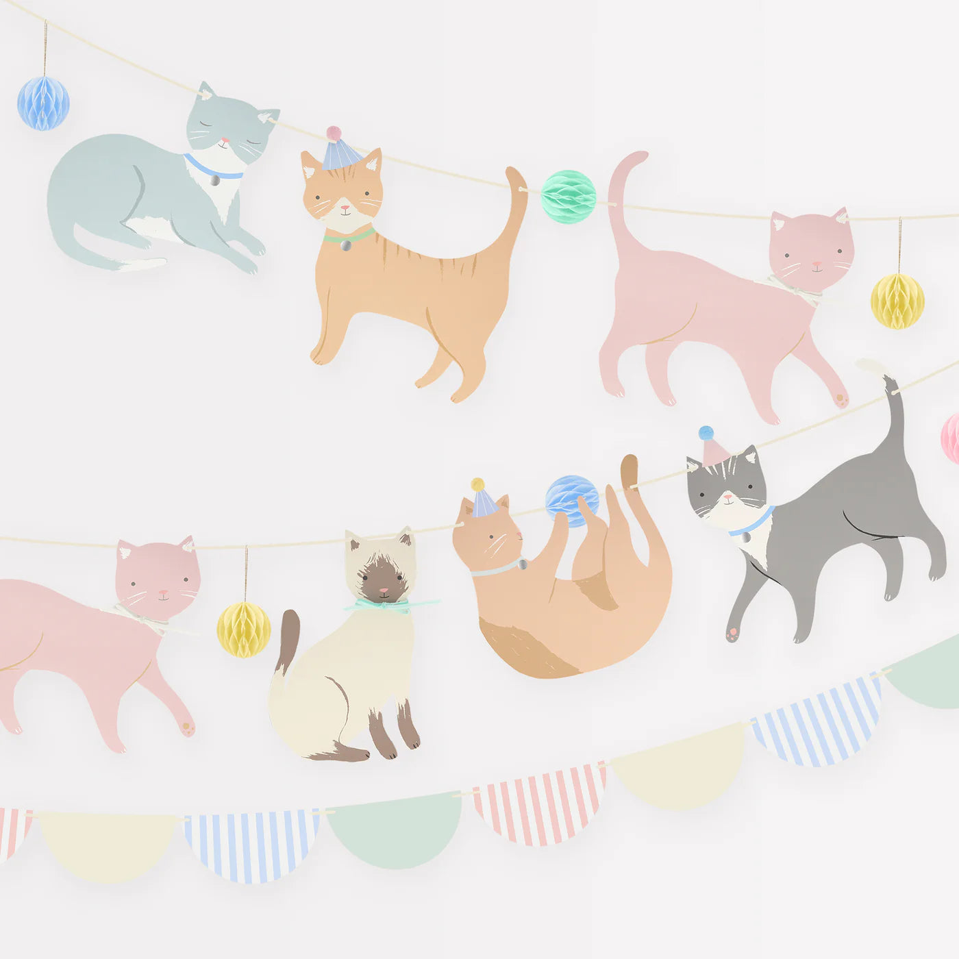 - Garland features 6 kittens, 5 tissue paper honeycomb balls and a scalloped garland with 12 pennants