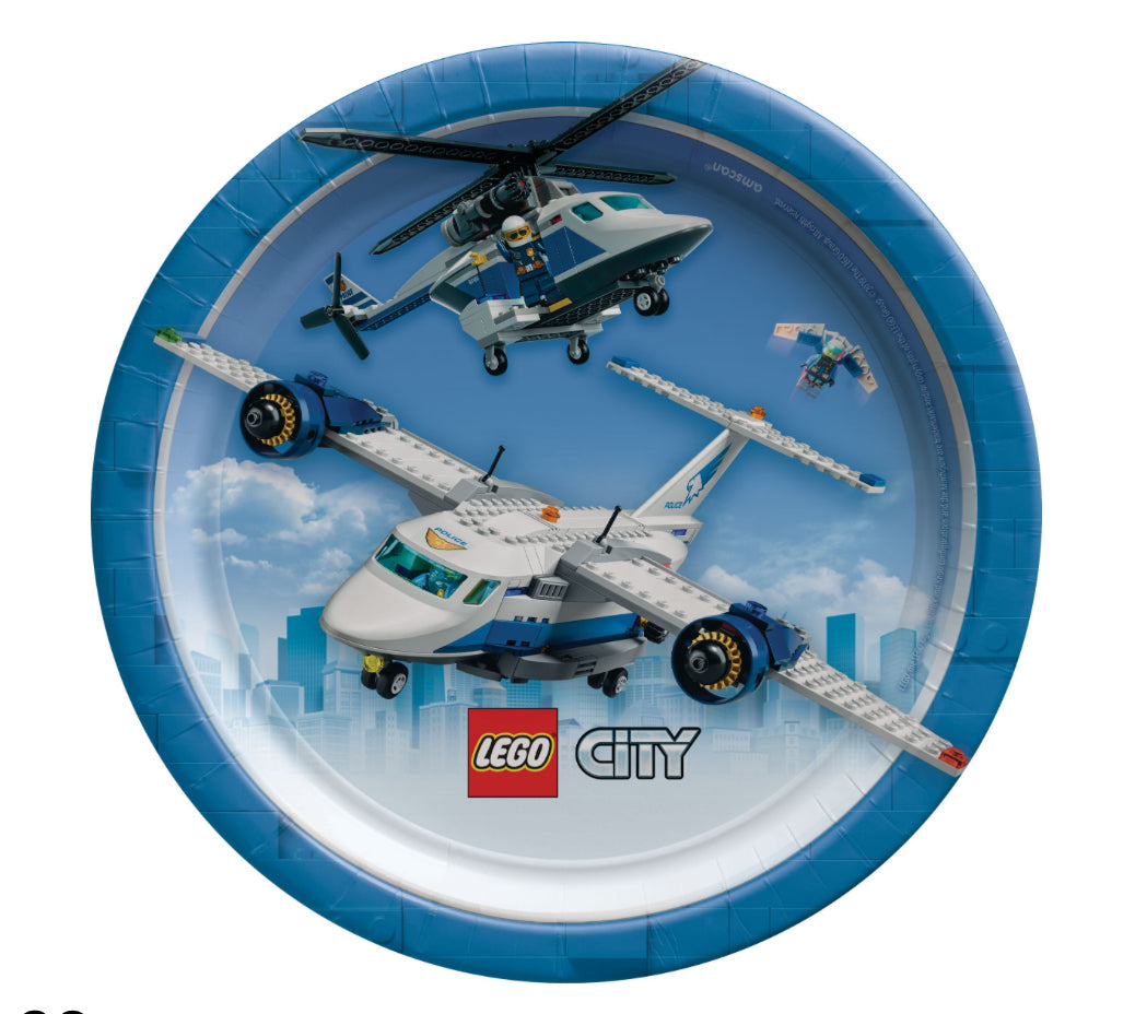 Small round paper plates feature a Sky Police airplane and helicopter plus a pilot minifigure ready for action