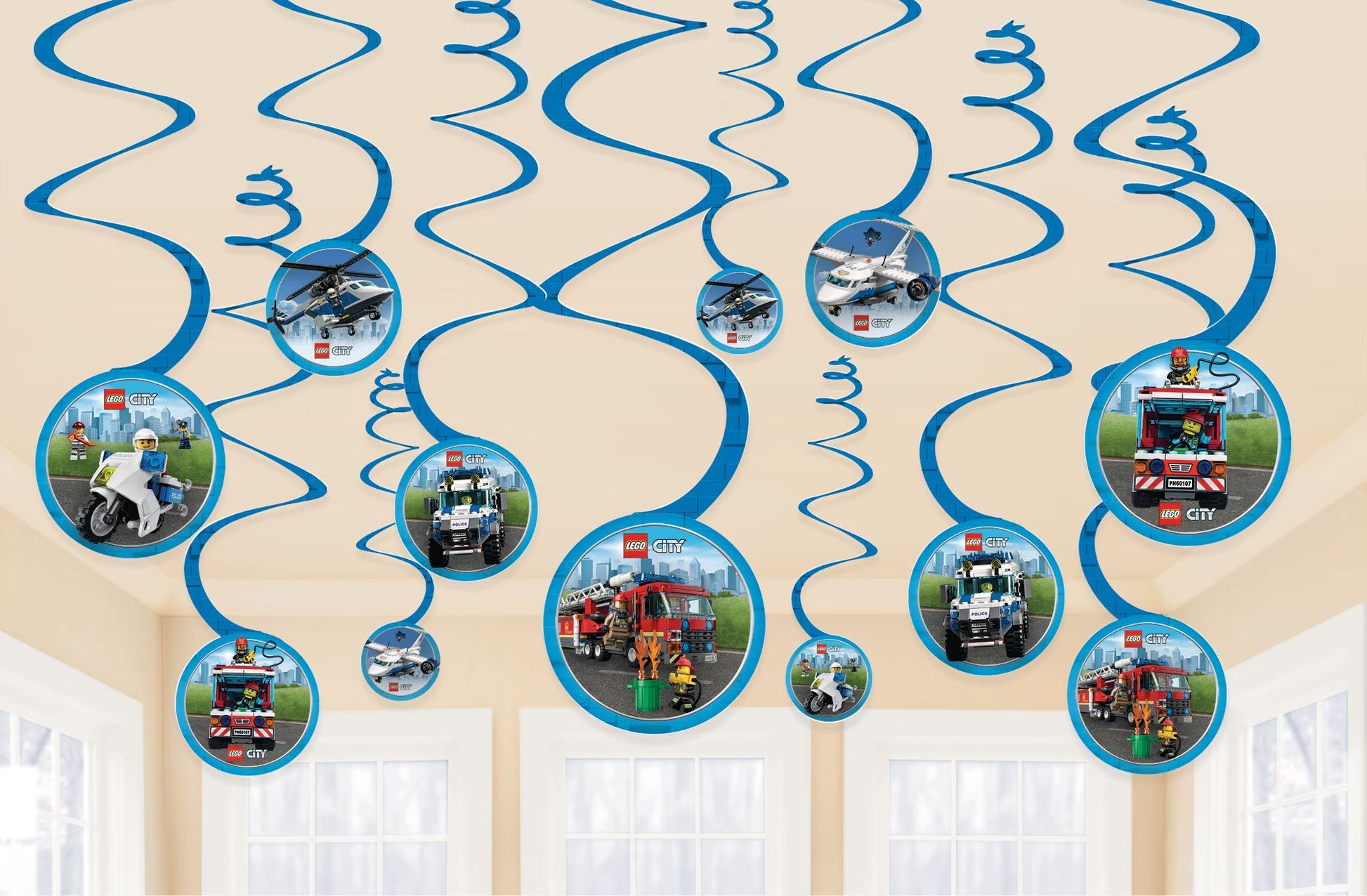 Invite all the favourite LEGO characters to your party room with LEGO City Swirl Decorations