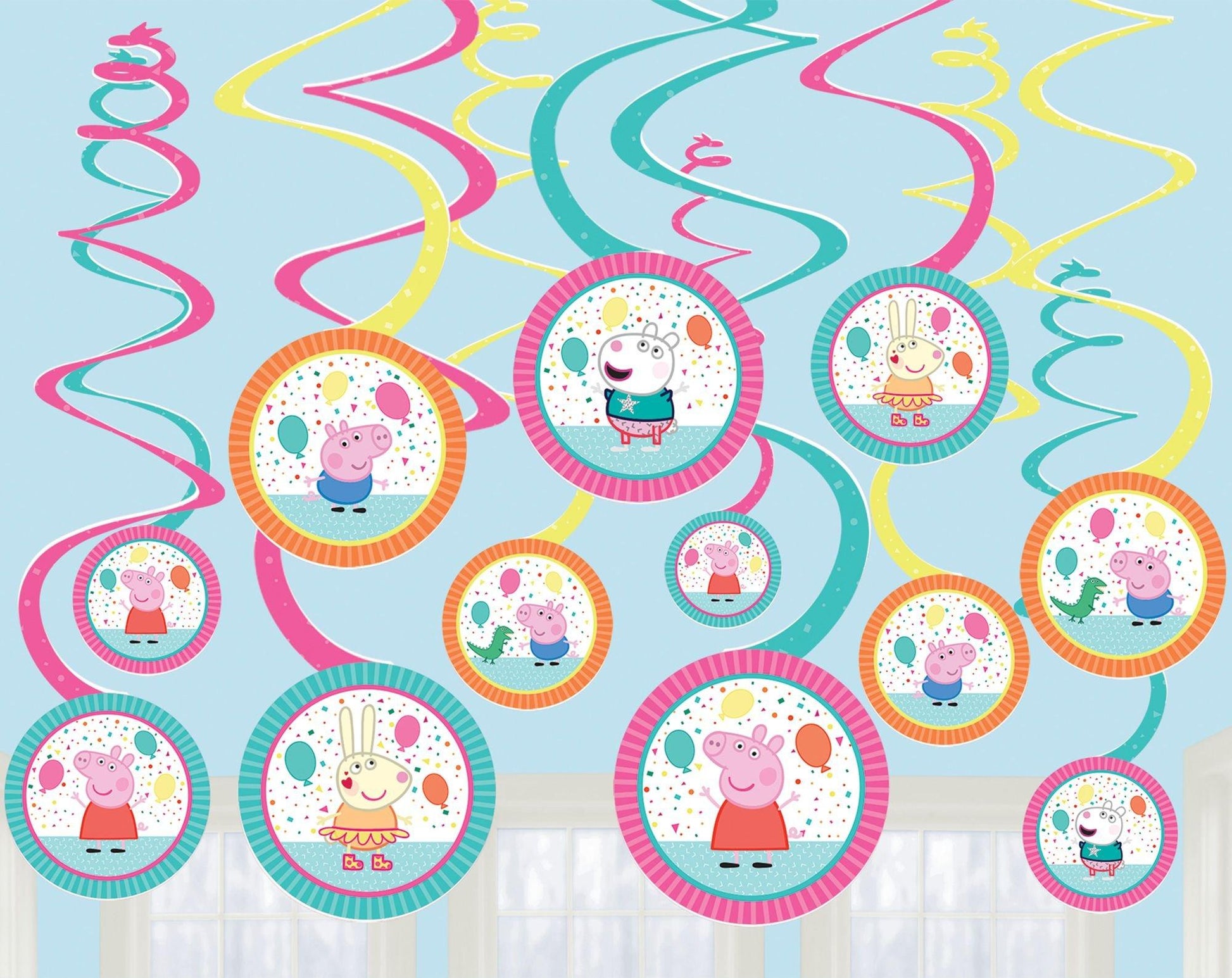 - COLORFUL & FUN DESIGN: These Peppa Pig Confetti Party Spiral Hanging Decorations feature assorted colored swirls with adorable Peppa Pig themed print cutouts, adding a festive touch to any kid's themed celebration. Pack of 12.