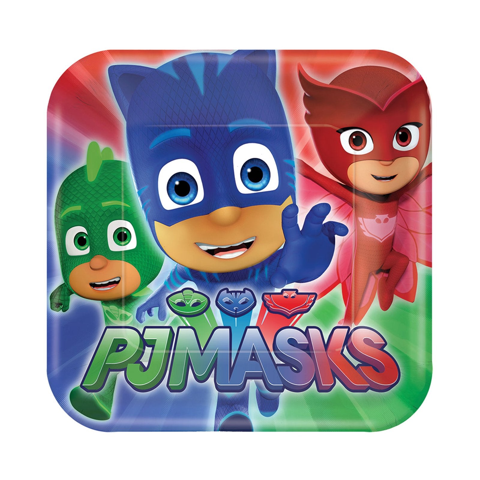 This 8 ct. package of 7" square paper dessert plates is part of the Amscan "PJ Masks" birthday party collection.