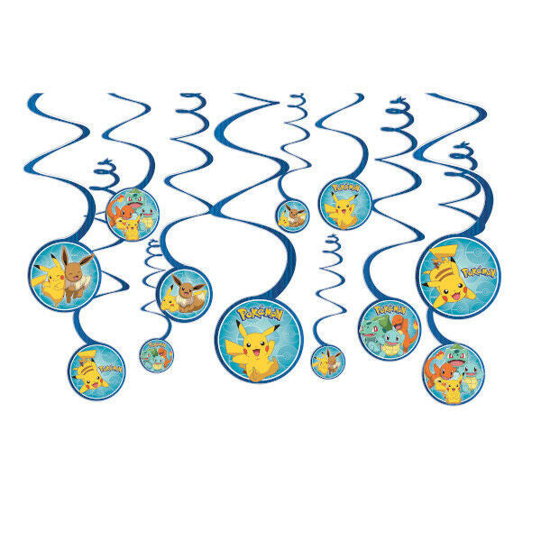 Set the scene with these Classic Pokémon Swirl Decorations! These hanging decorations feature swirls with images of Poké Balls, Pikachu, Eevee, and other Pokémon characters. They are perfect for your next party!