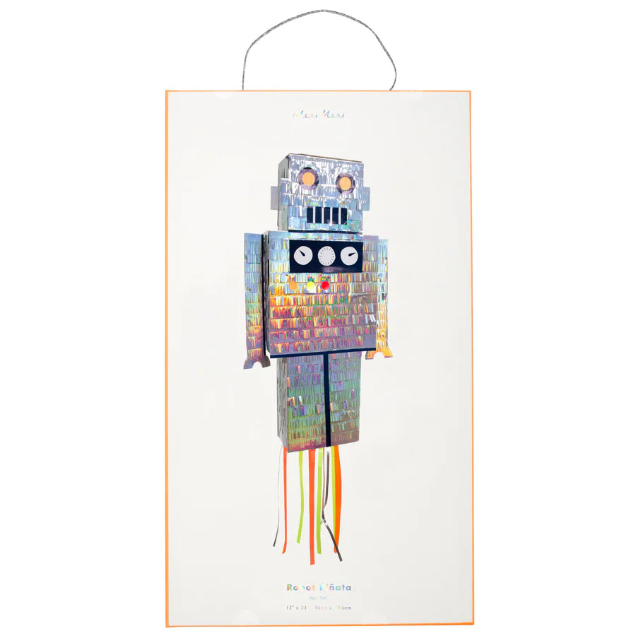 This shimmering robot piñata will make your party a smashing success! Featuring a shiny silver foil body and colorful ribbons to pull.