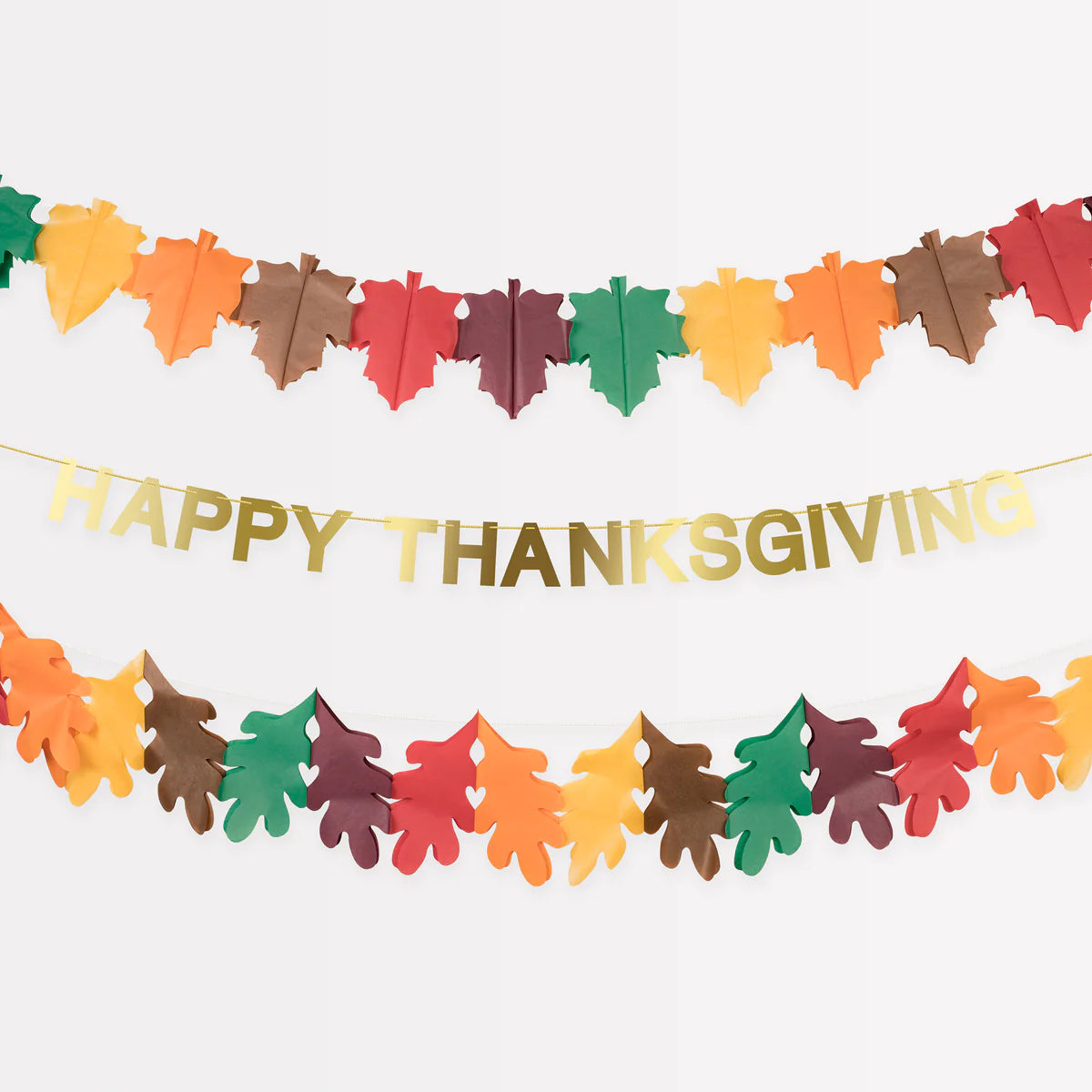 Bring the beauty of nature indoors with this statement garland. It skilfully captures the colors of fall leaves, and teams them with golden letters for a shimmering effect. The garland has 3 strands, which can be hung together, or split into separate sections – the choice is yours to create the look you want. Hang it in your porch, on a wall or on your Thanksgiving table for instant party style.