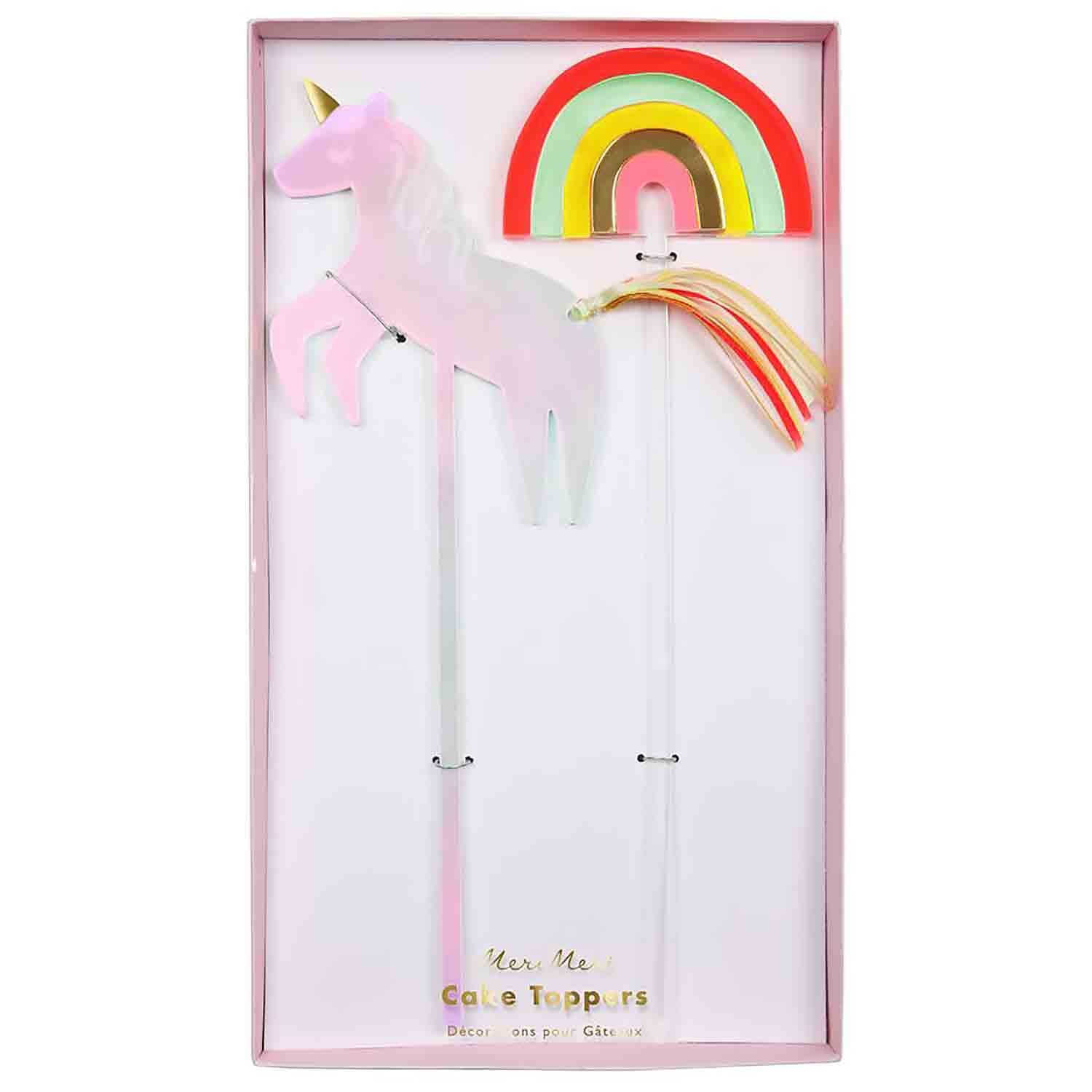 Use this cute cake top set to decorate cakes and other desserts. Set comes with one unicorn and one rainbow cake pick. Toppers are acrylic with fabric tassels.