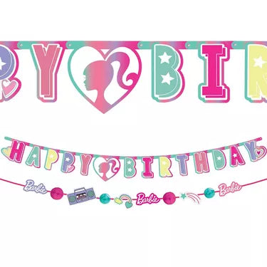 Create a super-cute pastel backdrop for their Barbie party with two banners. The first jointed banner spells out "Happy Birthday" with the Barbie silhouette in the center heart. The accent garland has cute cutouts and honeycomb balls.