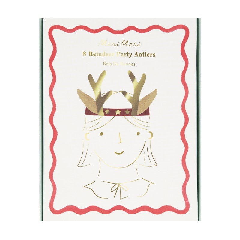 - 8 Reindeer paper antler headbands with 4 different colored velvet elastic details – dusty pink, dark green, red and light blue