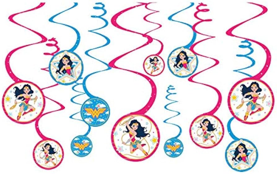 - This hanging decoration features red and blue swirls with an attached cutout printed with different images of Wonder Woman your child's favorite DC superhero.